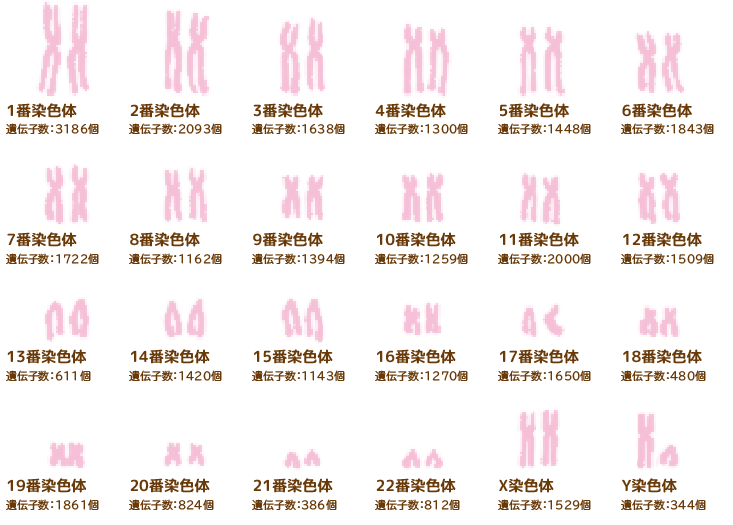 23本のうち、22本は「常染色体」とよばれ、大きい順に1番から22番まで番号が振られています。